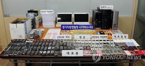 △ 압수된 대포폰 등 (수원=연합뉴스) 경기지방경찰청 사이버수사대는 대포폰 판매업자들로부터 사들인 타인 명의의 휴대전화 유심(USIM)칩으로 게임 아이템을 구매한 뒤 되판 혐의(컴퓨터 등 사용 사기 등) 한모(40)씨 등 4명을 구속했다고 23일 밝혔다. 또 불법 수집한 개인정보로 휴대전화 수백대를 개통해 이들에게 팔아넘긴 통신사 대리점 종업원 김모(35)씨 등 8명을 불구속 입건했다. 경찰이 압수한 물품들. 2015.7.23 <<경기지방경찰청>> you@yna.co.kr