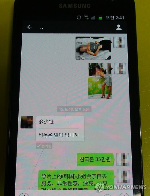 | △ '출장 성매매 여성' 알선 카카오톡 문자메시지 (인천=연합뉴스) 23일 오전 인천시 남구 인천지방경찰청 광역수사대 청사에서 경찰이 성매매 알선 조직원의 휴대전화를 취재진에 보여주고 있다. 휴대전화에는 중국인 관광객과 카카오톡 메시지를 주고 받은 내용이 들어 있다. 인천청 광수대는 성매매 알선 등 행위의 처벌에 관한 법률 위반 혐의로 인천 지역 모 폭력조직 행동대장 A(36)씨 등 폭력조직원 3명과 성매매 업주 B(58)씨 등 모두 6명을 구속하고, 성매매 여성 등 24명을 불구속 입건했다. 2015.7.23 <<인천지방경찰청>> son@yna.co.kr |