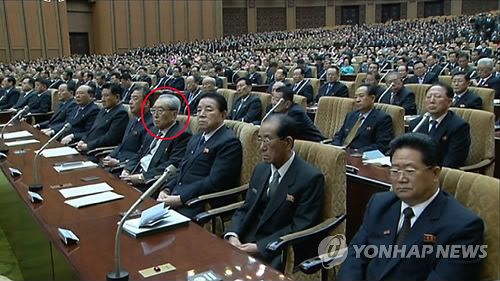△ 북한 김기남 노동당 비서가 지난 4월9일 열린 최고인민회의 제13기 3차 회의에서 핵심 당비서임에도 불구하고 주석단이 아닌 방청석에 앉아 눈길을 끌었다. 사진의 붉은 원이 김기남 당비서.