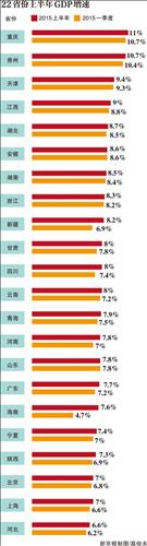 23일 신경보에 따르면 지금까지 공개된 22개 중국 성 및 직할시별 상반기 국내총생산(GDP) 성장률을 취합한 결과 중국 중서부 충칭이 11%의 증가율로 가장 높았고 다음이 구이저우(貴州)로 10.7%를 기록, 두 지역이 두자릿수 성장률을 기록했다.