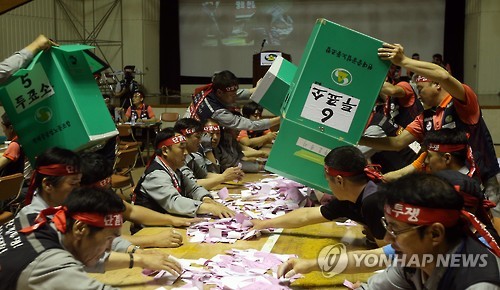 (울산=연합뉴스) 장영은 기자 = 현대중공업 노조 파업 찬반투표 잠정 개표 결과 찬성표가 과반을 넘어 가결됐다.