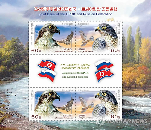 △ 북한, 러시아 영화제 개막…김정은 '큰 관심' 표명 최근 북한 평양에서 개막한 2차대전 승전 70주년 기념 러시아 영화 주간 행사에 북한 국방위원회 제1위워낮잉 큰 관심을 나타낸 것으로 전해졌다. 사진은 작년 북·러 외교관계 수립(10월 12일) 66주년을 맞아 양국이 발행한 공동우표.