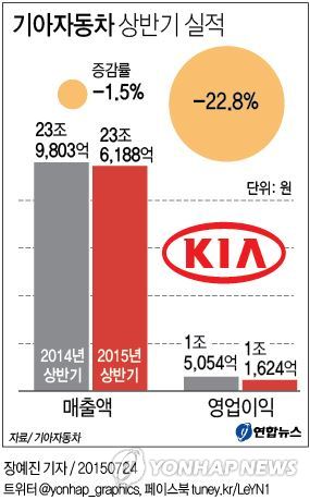 | △ <그래픽> 기아자동차 상반기 실적 (서울=연합뉴스) 장예진 기자 = 기아자동차가 올해 2분기에 유로화 약세 등 환율 영향으로 영업이익이 줄었으나 전분기보다는 확연히 개선되는 모습을 보였다. 올해 상반기 실적을 보면 기아차는 매출 23조6천188억원, 영업이익 1조1천642억원으로 작년 동기에 비해 각각 1.5%와 22.8%가 감소했다. jin34@yna.co.kr |