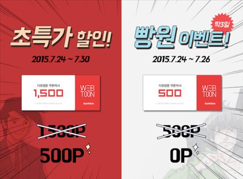 넥슨은 오는 30일까지 '다음웹툰 쿠폰캐시 1천500(1천500P)' 상품을 500포인트로 할인해주고 26일까지 3일간은 '다음웹툰 쿠폰캐시 500(500P)' 상품을 무상으로 제공한다.