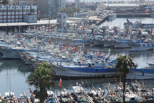 | △ 태풍 할롤라 북상…서귀포항으로 대피한 어선 (서귀포=연합뉴스) 고성식 기자 = 어선 등 선박들이 25일 제12호 태풍 할롤라의 북상으로 파도가 높게 이는 제주 남쪽 바다를 피해 서귀포항으로 대피해 있다. |