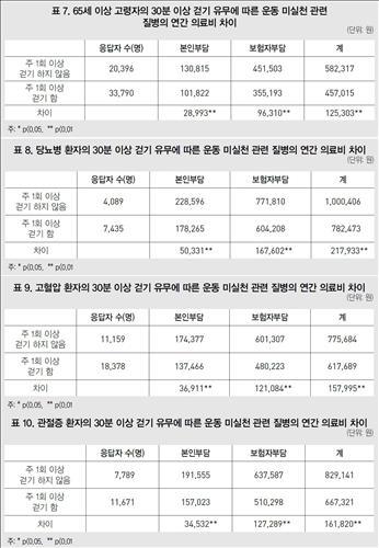 고 부연구위원은 건강보험공단의 건강보험코호트 데이터베이스를 토대로 2009~2010년 건강검진을 한 65세 이상 노인 5만4천186명을 대상으로 걷기 운동을 하는 정도와 보유 질병 등에 따른 의료비를 분석했다.