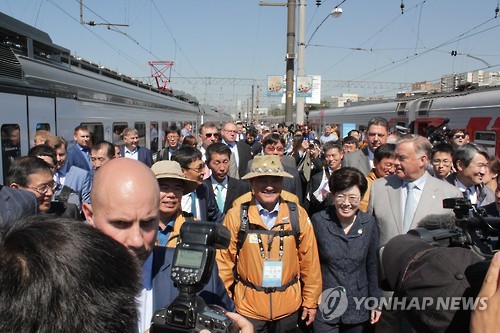 | △ 모스크바 야로슬라프스키역에 도착한 라시아 친선특급 (모스크바=연합뉴스) 유철종 특파원 = 26일(현지시간) 러시아 모스크바 야로슬라프스키역에 도착한 유라시아 친선특급 열차에서 내린 강창희 전 국회의장(중앙)과 최연혜 코레일 사장(강의장 오른쪽) 등이 블라디미르 야쿠닌 철도공사 사장(오른쪽 양복 입은 인사)의 영접을 받으며 환영식장으로 이동하고 있다. |