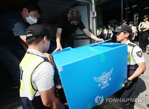 | △ 지난 15일 경찰이 '자주통일과 민주주의를 위한 코리아연대' 사무실에서 압수수색한 물품을 옮기고 있다. (연합뉴스 자료사진) |