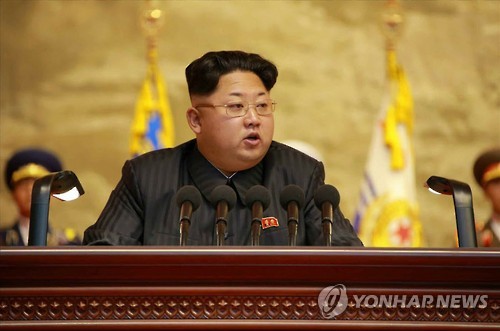 | △ 김정은 북한 국방위원회 제1위원장이 지난 25일 평양에서 열린 전국노병대회에서 축하 연설을 하고있다. (연합뉴스 자료사진) |