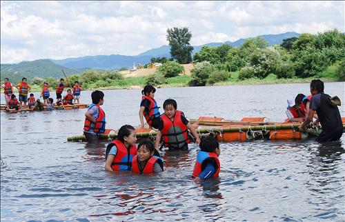 | △ 비단강숲 마을서 뗏목 체험하는 어린이들. |