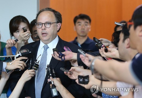 | △ 답변하는 사일러 미국 국무부 북핵 특사 (서울=연합뉴스) 김주성 기자 = 북핵 6자회담 미국측 차석대표인 시드니 사일러 국무부 북핵 특사가 27일 오후 서울 종로구 도렴동 외교부에서 김건 외교부 북핵외교기획단장과 면담을 한 뒤 취재진의 질문에 답하고 있다. |