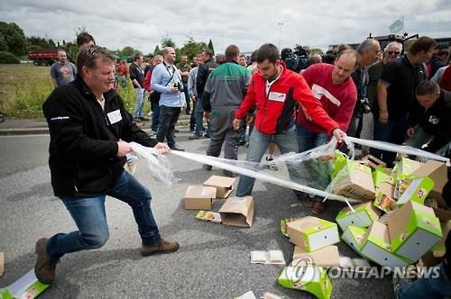 화가 난 일부 농민들은 외국 트럭에 실린 농산물을 끌어내 부수기도 했다.