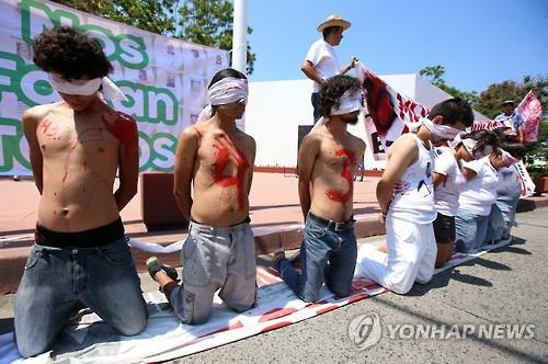 | △ 작년 9월 멕시코 게레로 주 이괄라 시에서 시위를 벌이던 교육대 학생들이 경찰과 결탁한 갱단에 끌려가 피살된 사건과 관련해 진상 규명과 정의 실현을 요구하는 시위가 26일(현지시간) 멕시코시티 시내에서 열렸다. (EPA=연합뉴스) |