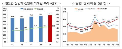 또 올해 상반기 전국 전·월세 거래 중 월세가 차지하는 비중은 43.4%를 기록, 2012년(33.9%)보다 9.5%포인트 증가했다.