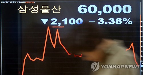(서울=연합뉴스) 강종훈 기자 = 삼성물산[000830] 주가가 28일 장중에 제일모직과의 합병 관련 주식매수청구권 행사가격 아래로 하락했다.