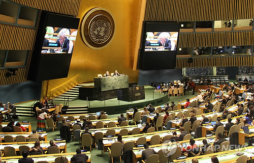 | △ 북한 인권 상황을 국제형사재판소(ICC)에 회부하도록 하는 내용의 북한 인권 결의안이 2014년 12월 18일(현지시각) 미국 뉴욕 유엔본부에서 열린 유엔총회 본회의에서 찬성 116표, 반대 20표, 기권 53표의 압도적인 차이로 가결됐다. 투표가 이뤄지기 직전 유엔 총회 본회의장의 회의가 진행되고 있다. 2014.12.19 |