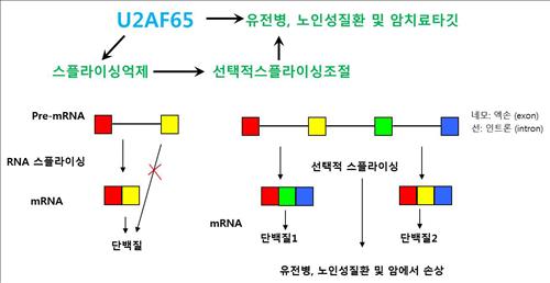 연구진은 핵단백질 'U2AF65'가 엑손들이 연결될 때 순서를 건너뛰면서 결합해 다양한 조합의 단백질을 만들어내는 '선택적 RNA 이어맞추기' 과정에도 영향을 미칠 것으로 가정하고 연구에 들어갔다.