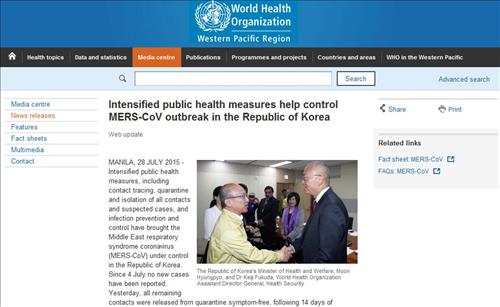 필리핀에 사무국을 둔 WPRO는 28일(현지시간) 홈페이지에 올린 '강화된 공공 보건 조치가 메르스 발발 상황을 통제하는 데 도움을 줬다'는 제목의 보도자료(news release)를 실었다.