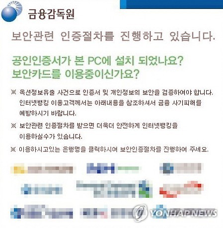 | △ 안 속을 수 없는 '가짜' 보안강화 팝업창 (수원=연합뉴스) 경기지방경찰청 사이버범죄수사대는 컴퓨터 사용 사기 등 혐의로 파밍 사기단 국내 인출총책 유모(27)씨 등 8명을 구속하고, 인출책 배모(48)씨 등 36명을 불구속 입건했다고 30일 밝혔다. 사진은 인터넷 팝업창. (경기지방경찰청 제공) |