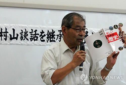| △ '무라야마담화를 계승·발전시키는 모임'이 2014년 8월 7일 일본 도쿄도(東京都) 참의원 회관에서 연 기자회견에서 다카시마 노부요시(高嶋伸欣) 류큐(琉球)대 명예교수가 극우 성향인 '새로운 역사교과서를 만드는 모임'(새역모) 계열의 이쿠호샤(育鵬社)의 역사 교과서를 들고 전쟁 책임 문제에 관한 기술 방식을 설명하고 있다. |