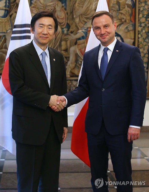 | △ 폴란드 대통령 당선인 예방한 윤병세 장관 (바르샤바<폴란드>=연합뉴스) 김도훈 기자 = 유라시아 친선특급 행사로 폴란드를 방문 중인 윤병세 외교부장관이 30일(현지시간) 폭살 거리에 위치한 대통령 당선인 사무실을 예방해 안제이 두다 당선인과 악수를 하고 있다. 올해 43세인 두다 당선인은 5월 치뤄진 결선에서 현 대통령인 브로니소브 코모로브스키 후보를 누르고 폴란드 역사상 최연소 대통령에 당선됐다. 취임식은 현 대통령의 임기 종료일인 8월 6일 두다 당선인이 의회에서 대통령 선서를 하는 방식으로 거행된다. |