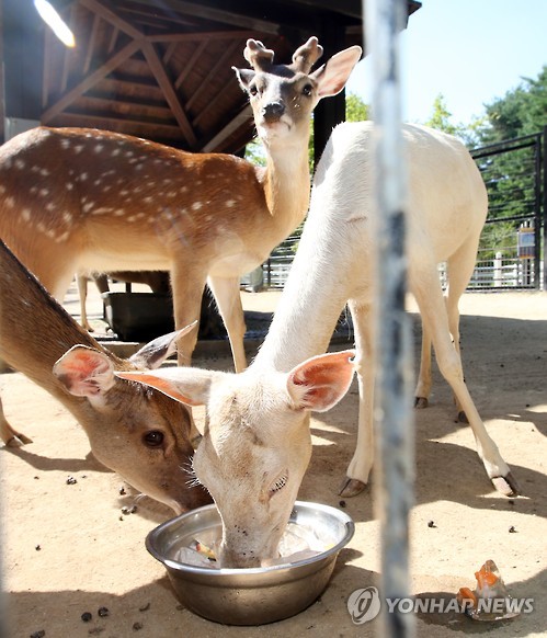 △ 폭염엔 얼음과일이 최고 (울산=연합뉴스) 이상현 기자 = 울산지역에 닷새째 폭염경보가 발령된 31일 울산대공원 동물원의 꽃사슴 가족이 얼음과일을 먹고 있다. 오른쪽 하얀색 동물은 다마사슴. 2015.7.31 leeyoo@yna.co.kr
