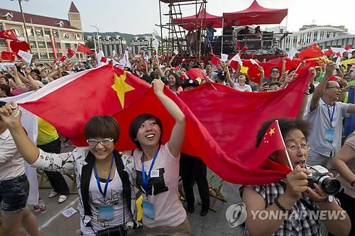 | △ (충리<中후베이성> AP=연합뉴스) 31일(현지시각) 중국 베이징이 2022 동계올림픽 개최지로 발표되자 노르딕 스키, 스키 점프, 기타 실외 종목이 열릴 스키 휴양지 후베이성 충리 주민들이 거리로 몰려나와 환호하고 있다. |