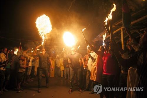 △ 1일 0시가 넘어 방글라데시 다시아르차라 마을이 인도령에서 방글라데시 영토로 이전되자 주민들이 이른바 '불쇼'를 하면서 환호하고 있다.(AFP=연합뉴스)