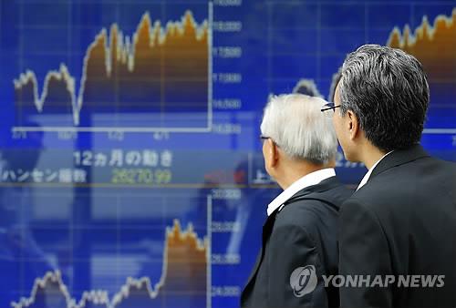 | △ 도쿄의 한 증권회사 전광판에 나타난 주가 시황을 지켜보는 투자자(AP=연합뉴스 자료사진) |