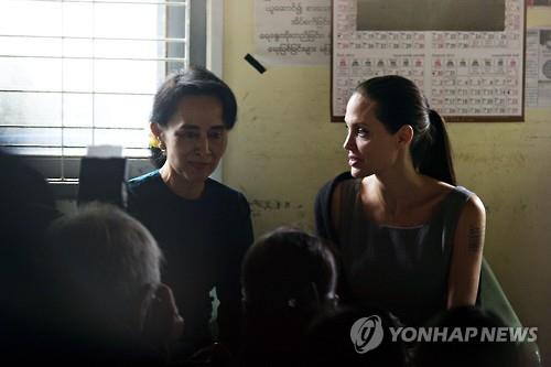 (양곤 AP·AFP=연합뉴스) 유엔난민기구 특사인 할리우드 배우 앤젤리나 졸리가 미얀마를 방문해 아웅산 수치 여사와 함께 의류공장 여성노동자들의 열악한 삶을 돌아봤다.