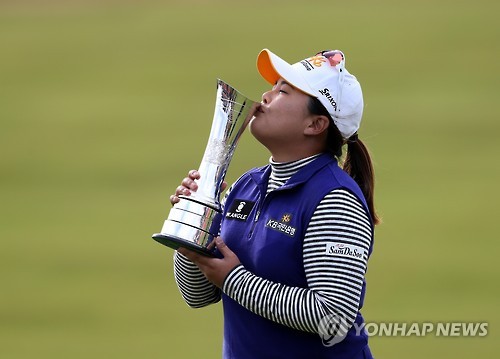 △ Inbee Park of South Korea poses with the trophy after winning the Women's British Open golf championship at the Turnberry golf course in Turnberry, Scotland, Sunday, Aug. 2, 2015. (AP Photo/Scott Heppell)