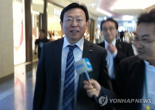 △ 출국장 향하는 신동빈 롯데그룹 회장 (도쿄=연합뉴스) 조준형 특파원 = 신동빈 롯데그룹 회장이 3일 오전 한국으로 출국하기 위해 일본 하네다공항에 도착, 취재진의 질문을 받고 있다. 2015.8.3 jhcho@yna.co.kr