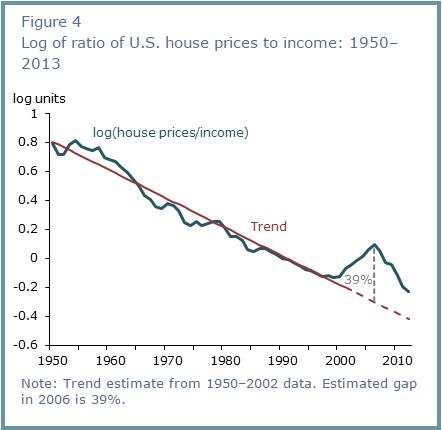 그런데 1950년부터 2013년까지 소득 대비 집값은 점점 하락하는 경향을 보였으며, 추세선에 비추어 보면 미국 주택 거품의 절정이던 2006년에는 집값에 약 39%의 거품이 있었다.