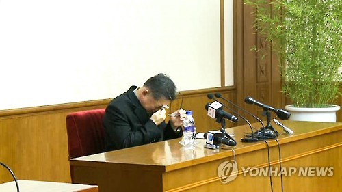 | △ 눈물 훔치는 북한 억류 임현수 목사 (서울=연합뉴스) 지난 1월 북한에 입국한 뒤 억류된 한국계 캐나다인 임현수(60) 목사가 30일 평양 인민문화궁전에서 기자회견을 하면서 눈물을 훔치고 있다. 조선중앙통신은 임 목사가 이날 북한 체제 전복 활동 등의 범죄 혐의를 인정했다고 전하며 동영상을 공개했다. 2015.7.31 nkphoto@yna.co.kr |