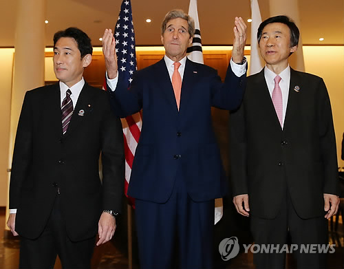 | △ 윤병세 외교부 장관(오른쪽부터), 존 케리 미국 국무부 장관, 기시다 후미오 일본 외무상 (연합뉴스 자료사진) |