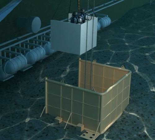 그리고나서 산소통을 멘 잠수부 2∼3명을 태운 안쪽 상자를 내려보내는 방식이다.