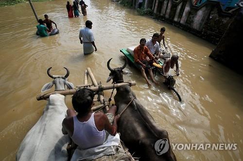 | △ 3일 인도 웨스트벵골 주 프라풀라 나가르에서 주민들이 소달구지와 자전거를 이용해 물에 잠긴 도로를 지나가고 있다.(EPA=연합뉴스) |