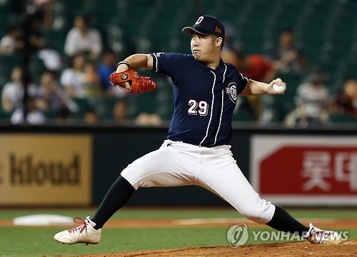 △ 역투하는 유희관 (울산=연합뉴스) 김용태 기자 = 4일 오후 울산 문수야구장에서 열린 두산 베어스와 롯데 자이언츠의 경기. 8회말 두산 선발 유희관이 힘차게 공을 던지고 있다.