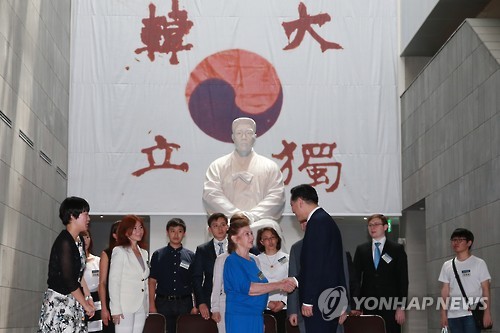 | △ 안중근 의사 기념관 찾은 독립유공자 후손 (서울=연합뉴스) 홍해인 기자 = 김현웅 법무부 장관이 5일 오전 서울 중구 남대문로 안중근 의사 기념관에서 광복 70주년을 앞두고 방한한 이위종 열사의 손녀이자 이범진 초대주러공사의 외증손녀 예피모바 류드밀라 씨(앞줄 파란옷) 등 독립유공자 후손들과 안중근 의사 동상 앞에서 인사하고 있다. 2015.8.5 hihong@yna.co.kr |