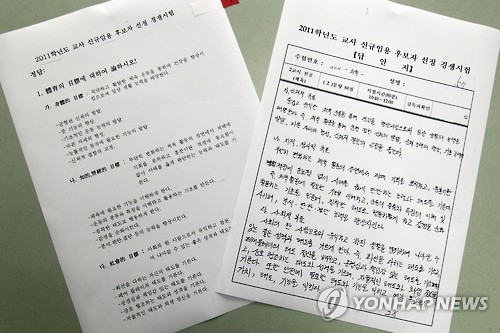 | △ 모범답안과 똑같은 답안 (대전=연합뉴스) 김소연 기자 = 5일 대전지방검찰청에서 열린 '학교법인 대성학원 교사 채용비리 등 중간 수사결과 발표 브리핑'에서 검찰이 공개한 모범답안(좌)과 응시자가 실제 답안(우). 실제 답안과 모범답안이 거의 비슷하게 작성 돼 있다. 2015.8.5 soyun@yna.co.kr |