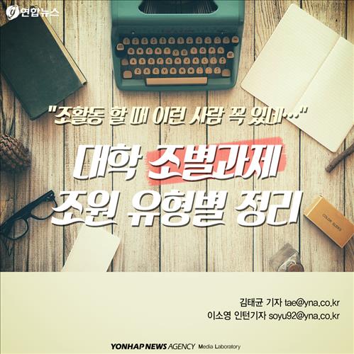 (서울=연합뉴스) 김태균 기자·이소영 인턴기자 = 대학 생활의 필수 요소인 조별 과제. 그런데 이게 도통 쉬운 일이 아니랍니다. 사람만 모은다고 결과가 '뚝딱' 나온다고 믿으면 심히 '오산'이죠. 각양각색 캐릭터의 등장으로 바람 잘 날 없다는 조별 과제의 세계를 살펴볼까요?