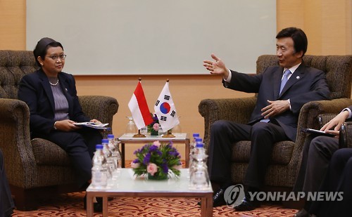 | △ 대화하는 한-인도네시아 (쿠알라룸푸르=연합뉴스) 박동주 기자 = 윤병세 외교부 장관이 5일 말레이시아 쿠알라룸푸르 푸트라세계무역센터(PWTC)에서 열린 한-인도네시아 외교장관회담에서 레트노 마르수디 인도네시아 외무장관과 대화하고 있다. |