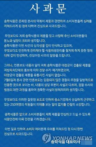 경찰은 송학식품이 이달 초 언론보도를 통해 이번 사건이 알려진 직후 자사 인터넷 홈페이지에 거짓 사과문을 올리고, 퇴사하려는 직원을 상대로 증거 인멸을 시도한 정황이 있다고 보고 있다.