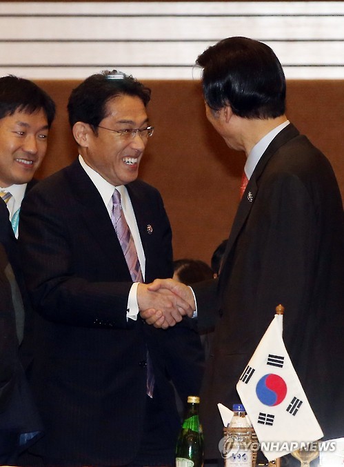 | △ 인사 나누는 한일 (쿠알라룸푸르=연합뉴스) 박동주 기자 = 윤병세 외교부 장관과 기시다 후미오(岸田文雄) 일본 외무상이 6일 말레이시아 쿠알라룸푸르 푸트라세계무역센터(PWTC)에서 열린 ASEAN+3(한중일) 외교장관회의에서 악수하고 있다. |