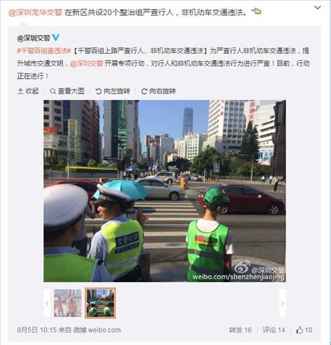 선전시 교통공안도 웨이보에 자원봉사자들 사진을 올리면서 "빨간불은 짧지만 인생은 깁니다. 여러분 기다리세요. 빨간불에 길을 건너다 잡히면 처음에는 녹색 조끼를 입지만 두 번째에는…"이라고 글을 올리는 등 예상치 못한 '논란'을 즐기는 모양새다.