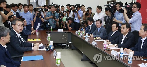 | △ 대기업 소유구조 관련 당정협의 (서울=연합뉴스) 이상학 기자 = 정재찬 공정거래위원장(왼쪽 두번째)이 6일 오후 국회에서 열린 롯데 등 대기업 소유구조 관련 당정협의에서 회의 시작을 기다리고 있다. 오른쪽 두번째는 새누리당 김정훈 정책위의장. |
