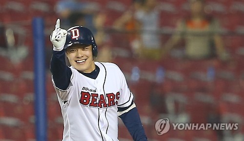 △ 민병헌 '이거야!' (서울=연합뉴스) 김도훈 기자 = 6일 오후 서울 잠실야구장에서 열린 2015 프로야구 넥센 히어로즈와 두산 베어스 경기. 4회말 1사 만루 두산 민병헌이 싹쓸이 3루타를 쳐낸 뒤 기뻐하고 있다. 2015.8.6 superdoo82@yna.co.kr