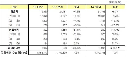 2분기 컨테이너 부문 매출액은 운임단가 하락의 영향으로 1조8천340억원을 기록하며 전년 동기 대비 5.4% 줄었다.