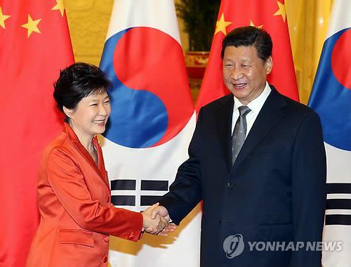 | △ 박근혜 대통령과 시진핑 중국 국가주석이 지난해 11월 베이징 인민대회당에서 열린 한-중 정상회담에서 밝은 표정으로 악수하고 있다.(연합뉴스 자료사진) |