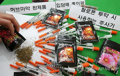 | △ 올 2월 신종 마약 '허브'를 국내에 유통한 일당이 처음으로 경찰에 적발됐다. 이들에게 허브 마약을 산 구매자 가운데 중·고등학생이 8명이나 포함된 것으로 알려졌다. 사진은 지난 2월 압수한 허브마약 완제품과 제조기, 주사기. (연합뉴스 자료사진) |